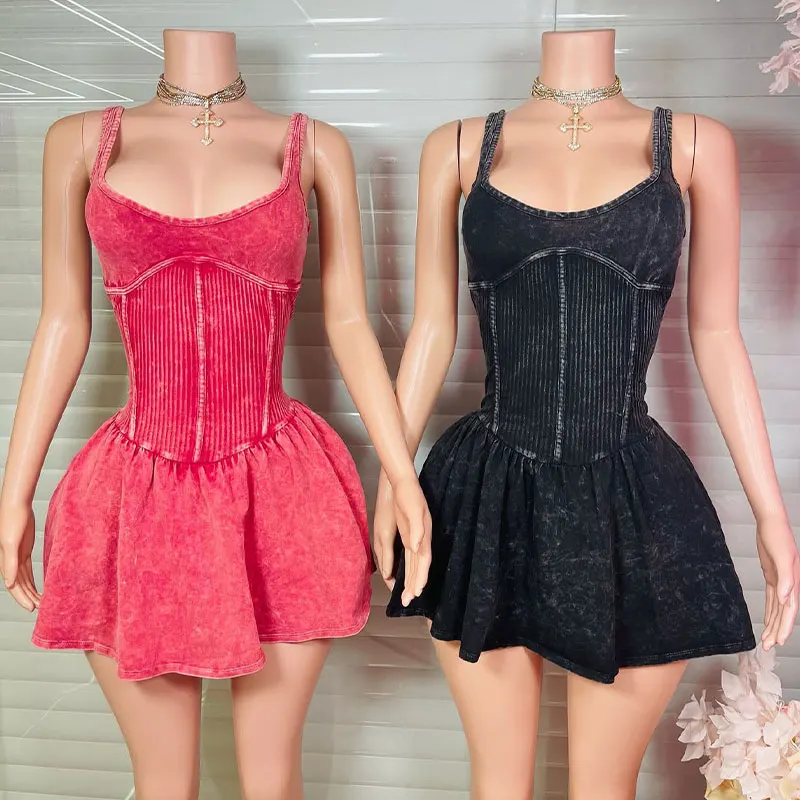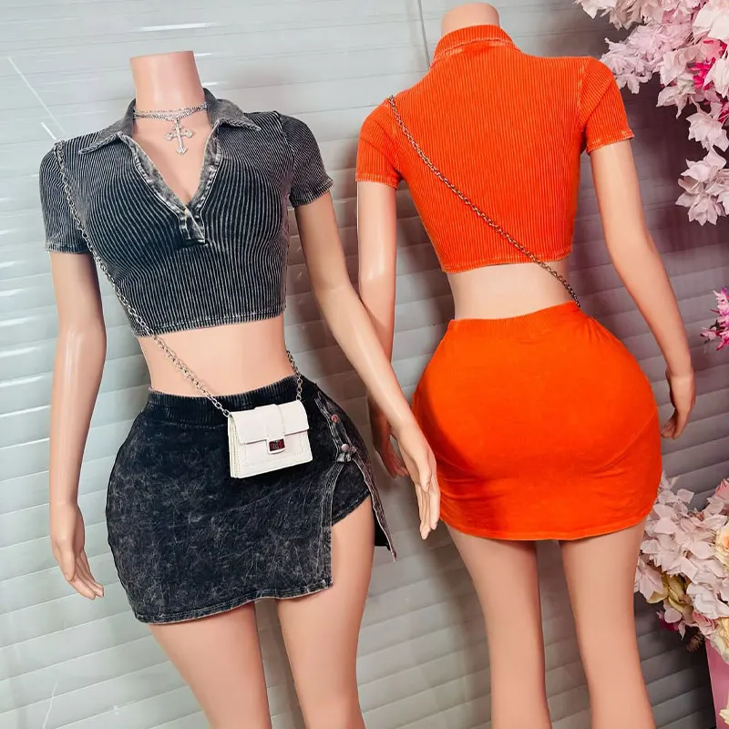 Huili Manufacturers High Quality Cotton Acid Wash Summer Crop Top & Mini Skirt Custom Heavyweight Ribbed Two Piece Set for Women